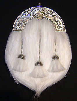 White dress sporran with a celtic dogs cantle (Pewter top) The sporran is made with lorica and faux fur and is availble with either crossed or straight tassels.