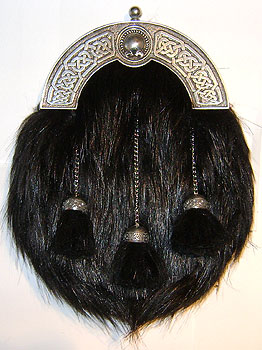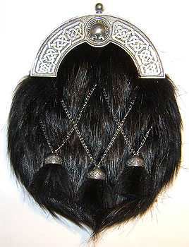 Black dress sporran with a celtic torque cantle (Pewter top) The sporran is made with lorica and faux fur and is availble with either crossed or straight tassels.